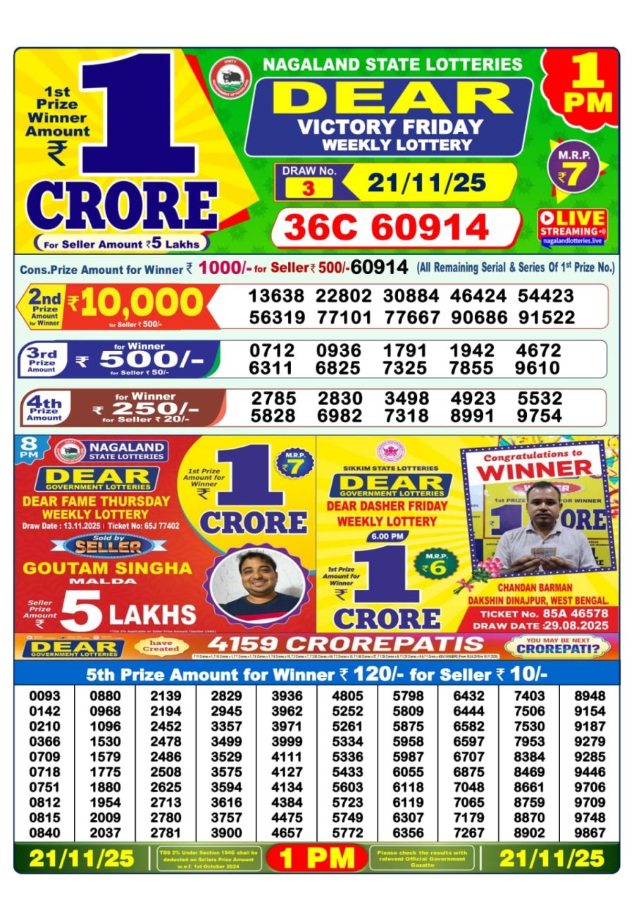 Dear Lottery 1 PM Result Today – 21 November 2025 – Live Draw & Winners