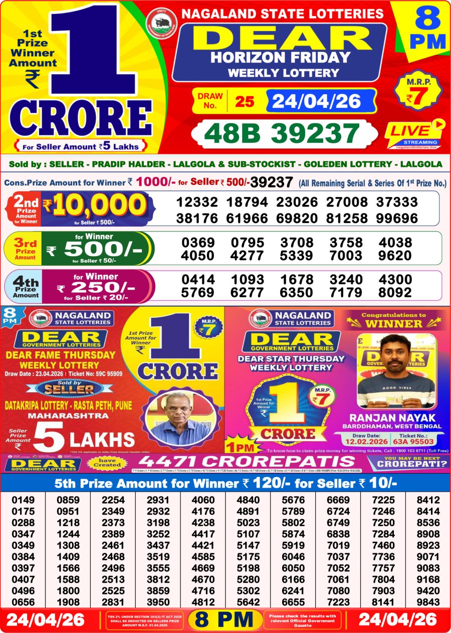 Dear Lottery 8 PM Result – 24 April 2026 – Live Draw & Winners April 24, 2026 Related Results Dear Lottery 8 PM Result – 18 January 2026 – Live Draw & Winners Rajshree Lottery 8 PM Result – 23 May 2025 – Full Result with PDF Link Rajshree Lottery 8 PM Result – 30 July 2025 – Live Draw & Winners Dear Lottery 8 PM Result – 03 November 2025 – Live Draw & Winners