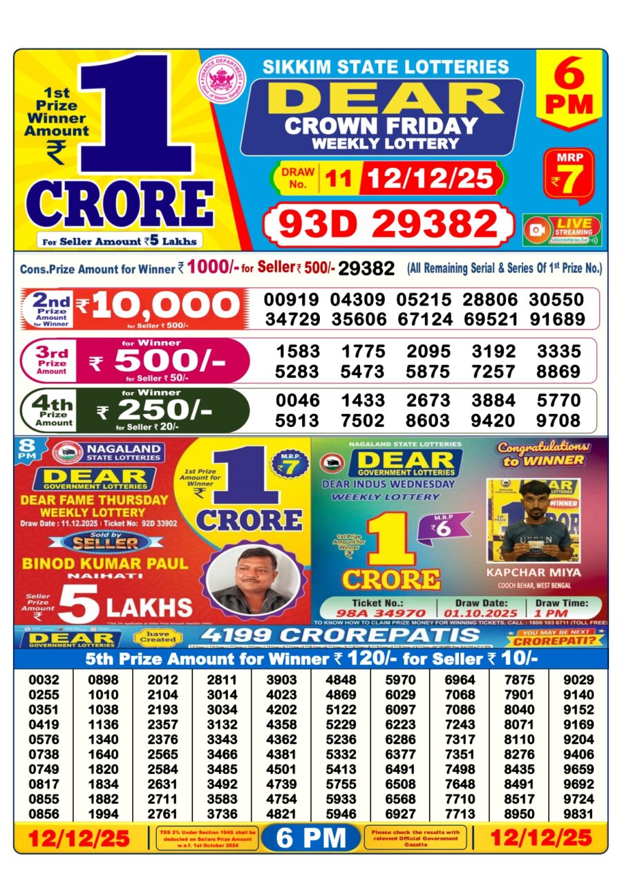 Dear Lottery Result 6 PM – 12 December 2025 – Live Draw & Winners December 12, 2025 Related Results Dear Lottery Result 6 PM – 29 September 2025 – Live Draw & Winners Dear Lottery Result 6 PM – 16 August 2025 – Live Draw & Winners Punjab State Dear 50 Lottery Result – 6 PM Draw – 15 November 2025 – Live Draw & Winnersr Dear Lottery Result 6 PM – 01 August 2025 – Live Draw & Winners