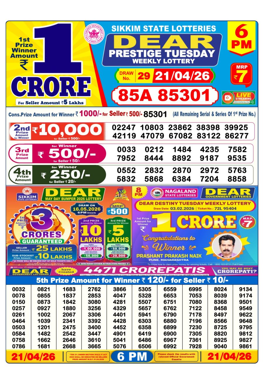 Dear Lottery Result 6 PM – 21 April 2026 – Live Draw & Winners April 21, 2026 Related Results Punjab State Dear 50 Lottery Result – 6 PM Draw – 6 November 2025 – Live Draw & Winnersr Punjab State Dear 50 Lottery Result – 6 PM Draw – 16 November 2025 – Live Draw & Winnersr Dear Lottery Result 6 PM – 22 March 2026 – Live Draw & Winners Dear Lottery Result 6 PM – 31 August 2025 – Live Draw & Winners