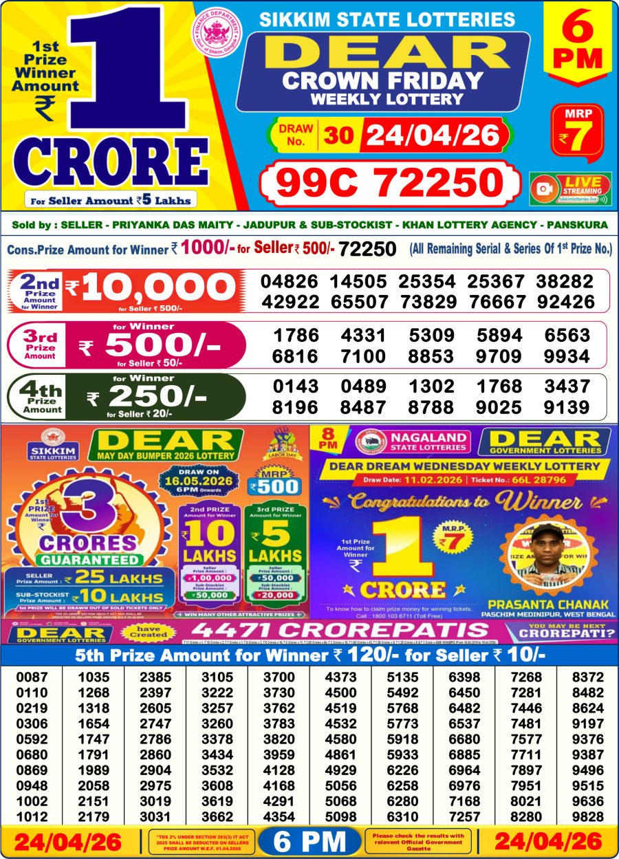 Dear Lottery Result 6 PM – 24 April 2026 – Live Draw & Winners April 24, 2026 Related Results Dear Lottery Result 6 PM – 23 March 2026 – Live Draw & Winners Punjab State Dear 50 Lottery Result – 6 PM Draw – 31 December 2025 – Live Draw & Winners Dear Lottery Result 6 PM – 8 December 2025 – Live Draw & Winners Punjab State Dear 50 Lottery Result – 6 PM Draw – 20 December 2025 – Live Draw & Winners
