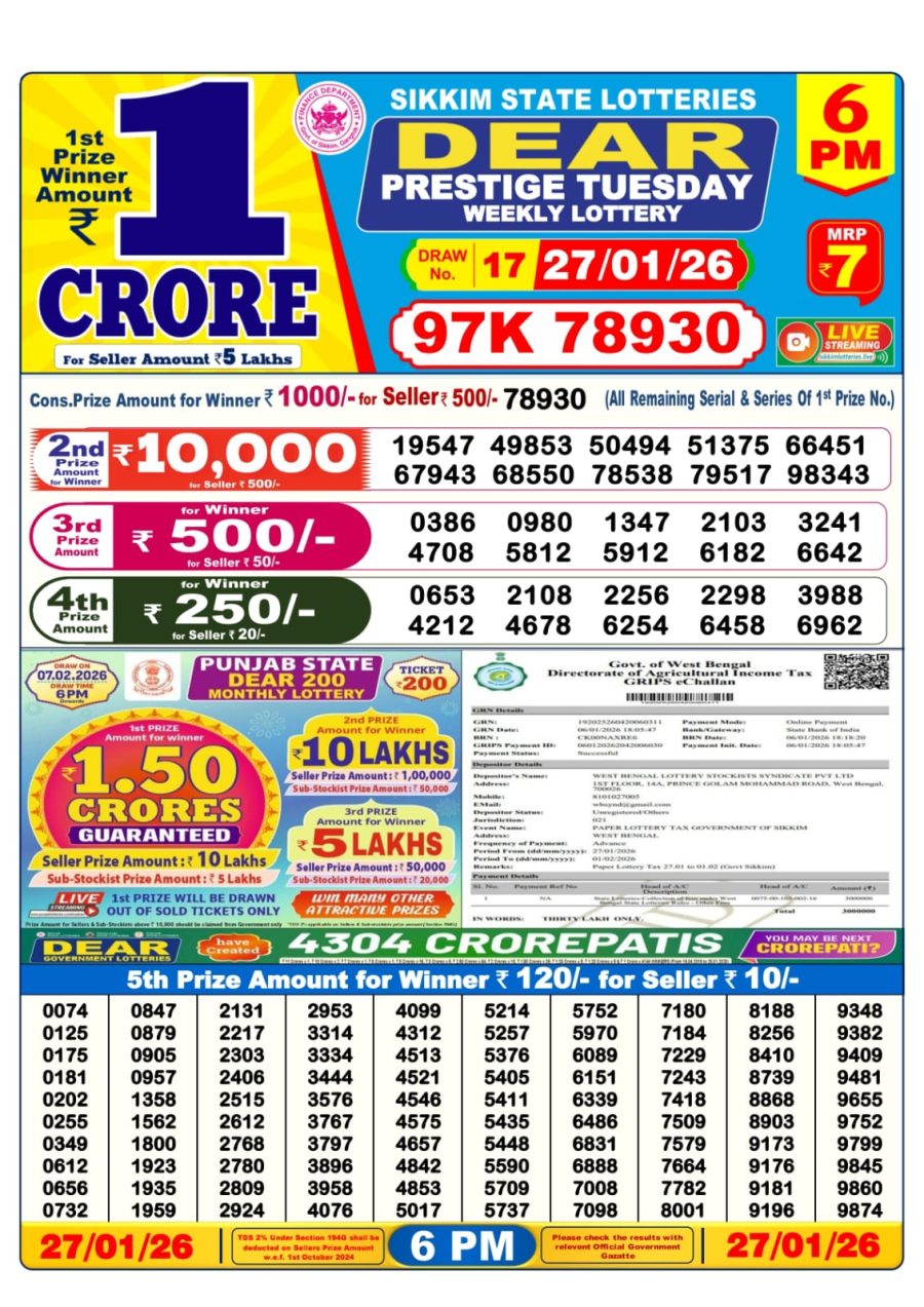 Dear Lottery Result 6 PM – 27 January 2026 – Live Draw & Winners January 27, 2026 Related Results Punjab State Dear 50 Lottery Result – 6 PM Draw – 04 January 2026 – Live Draw & Winners Punjab State Dear 50 Lottery Result – 6 PM Draw – 12 December 2025 – Live Draw & Winners Dear Lottery Result 6 PM – 15 September 2025 – Live Draw & Winners Punjab State Dear 50 Lottery Result – 6 PM Draw – 13 November 2025 – Live Draw & Winnersr