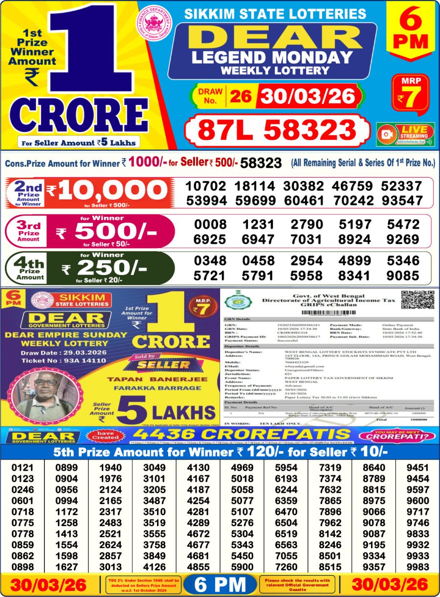 Dear Lottery Result 6 PM – 30 March 2026 – Live Draw & Winners March 30, 2026 Related Results Dear Lottery Result 6 PM – 24 June 2025 – Live Draw & Winners Dear Lottery Result 6 PM – 13 March 2026 – Live Draw & Winners Dear Lottery Result 6 PM – 26 June 2025 – Live Draw & Winners Dear Lottery Result 6 PM – 4 December 2025 – Live Draw & Winners