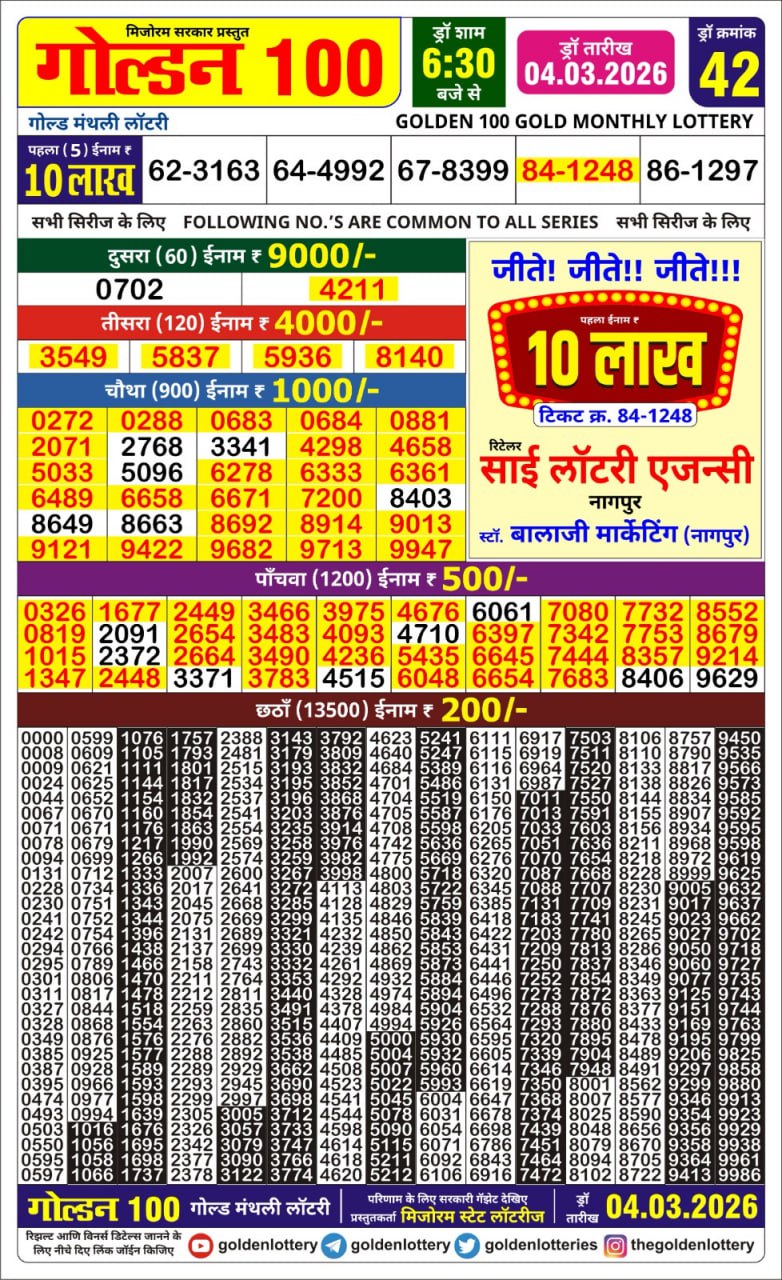 Golden 100 Monthly Lottery Result 04 March 2026 March 4, 2026 Related Results Punjab State Dear 20 monthly Lottery Result – 23 December 2025 – Live Draw & Winners Rajshree 500 Monthly Lottery Result 10 February 2026 Kerala Lottery Result DhanaLekshmi DL27 19 November 2025 MahaShivratri Bumper Lottery Result Today 21 February 2026