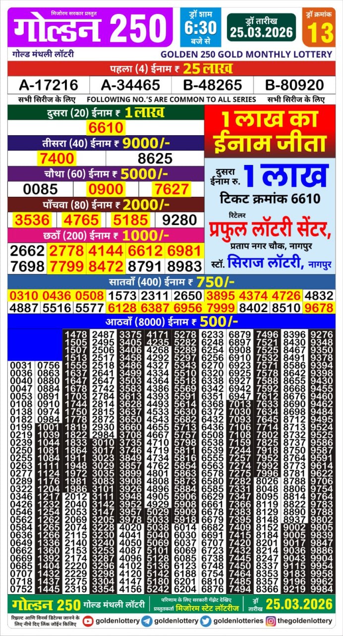 Golden 250 Monthly Lottery Result24 March 2026 March 25, 2026 Related Results Kerala state Lottery Result 10.04.2025 Thiruvonam Bumper BR 105 Winner list &Prize Breakdown Dear 2000 Monthly Lottery Result – 14 February 2026 Rajshree 200 Monthly Lottery Result 19 February 2026 Kerala Lottery Result Karunya Plus KN606 15 January 2026