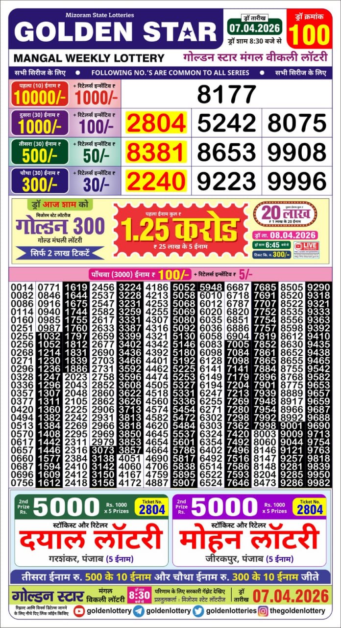 Golden Star Lottery Result 8.30 PM Today – 07 April 2026 – Live Draw & Winners April 7, 2026 Related Results Golden Star Lottery Result 9 PM Today – 15 December 2025 – Live Draw & Winners Golden Star Lottery Result 9 PM Today – 7 December 2025 – Live Draw & Winners Golden 200 gold monthly lottery result 21 May 2025 Golden 100 Monthly Lottery Result 03 December 2025