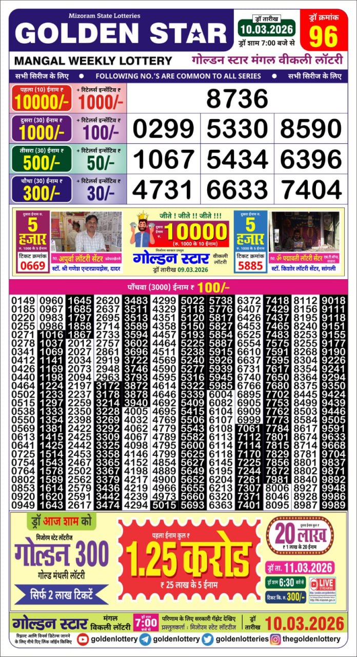 Golden Star Lottery Result 7 PM Today – 10 March 2026 – Live Draw & Winners March 10, 2026 Related Results Golden Star Lottery Result 9 PM Today – 25 November 2025 – Live Draw & Winners Golden Star Lottery Result 7 PM Today – 03 February 2026 – Live Draw & Winners Golden Star Lottery Result 9 PM Today – 14 April 2026 – Live Draw & Winners Golden Star Lottery Result 9 PM Today – 24 October 2025 – Live Draw & Winners