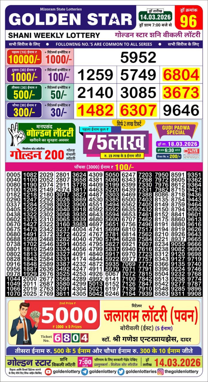 Golden Star Lottery Result 7 PM Today – 14 March 2026 – Live Draw & Winners March 14, 2026 Related Results Golden Star Lottery Result 9 PM Today – 10 April 2026 – Live Draw & Winners Golden Star Lottery Result 7 PM Today – 19 February 2026 – Live Draw & Winners Golden Star Lottery Result 9 PM Today – 24 October 2025 – Live Draw & Winners Golden Star Lottery Result 9 PM Today – 7 November 2025 – Live Draw & Winners