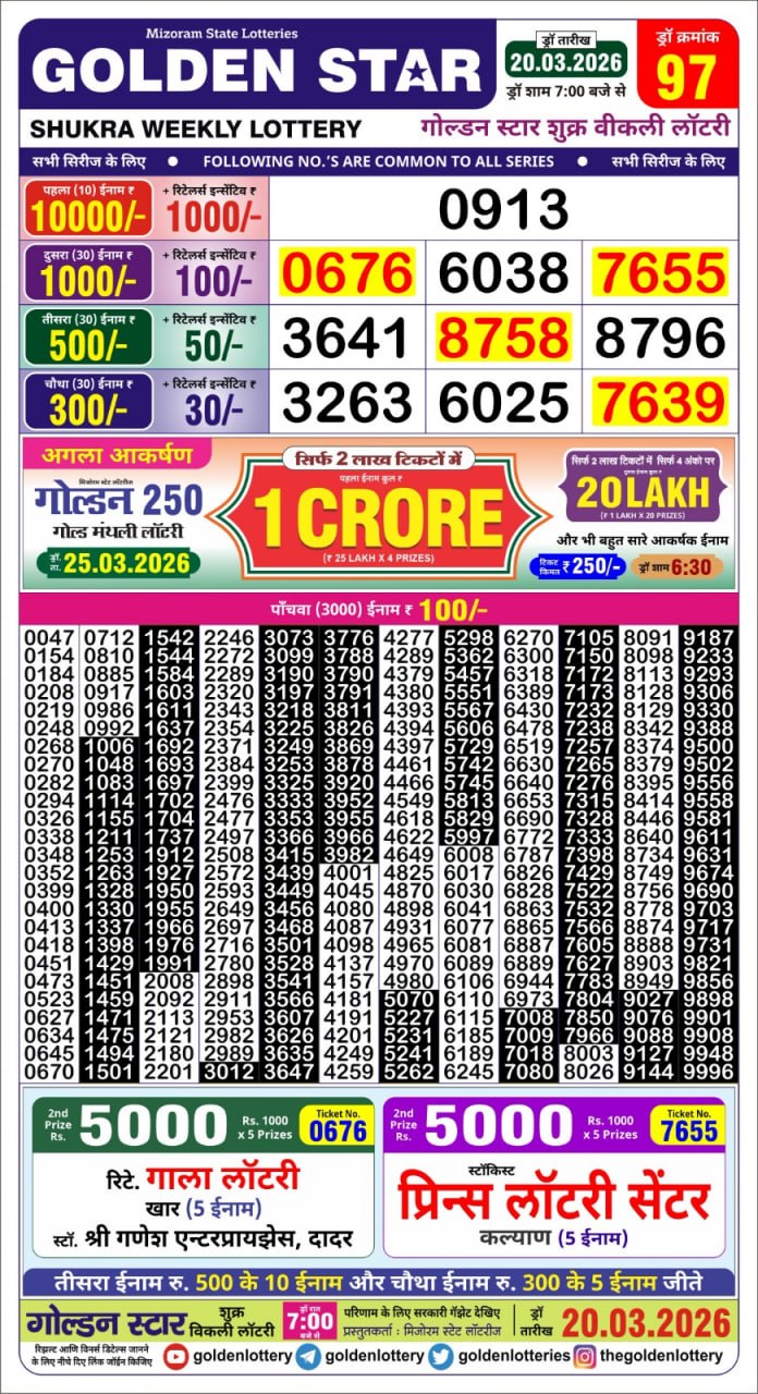 Golden Star Lottery Result 7 PM Today – 20 March 2026 – Live Draw & Winners March 20, 2026 Related Results Golden Star Lottery Result 9 PM Today – 28 November 2025 – Live Draw & Winners Golden Star Lottery Result 9 PM Today – 14 November 2025 – Live Draw & Winners Golden Star Lottery Result 7 PM Today – 06 March 2026 – Live Draw & Winners Golden Star Lottery Result 7 PM Today – 02 March 2026 – Live Draw & Winners
