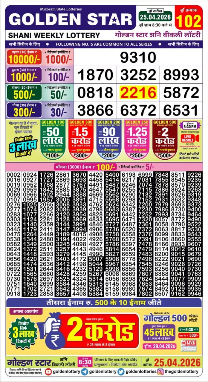 Golden Star Lottery Result 8:30 PM Today – 25 April 2026 – Live Draw & Winners April 25, 2026 Related Results Golden Star Lottery Result 8:30PM Today – 09 April 2026 – Live Draw & Winners Golden Star Lottery Result 9 PM Today – 12 April 2026 – Live Draw & Winners Golden Star Lottery Result 9 PM Today – 6 December 2025 – Live Draw & Winners Golden Star Lottery Result 8:30 PM Today – 21 April 2026 – Live Draw & Winners