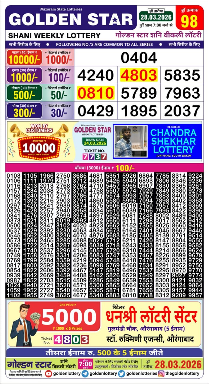 Golden Star Lottery Result 7 PM Today – 28 March 2026 – Live Draw & Winners March 28, 2026 Related Results Golden Star Lottery Result 9 PM Today – 23 November 2025 – Live Draw & Winners Golden Star Lottery Result 9 PM Today – 15 January 2026 – Live Draw & Winners Golden Star Lottery Result 9 PM Today – 2 September 2025 – Live Draw & Winners Golden Star Lottery Result 9 PM Today – 21 November 2025 – Live Draw & Winners