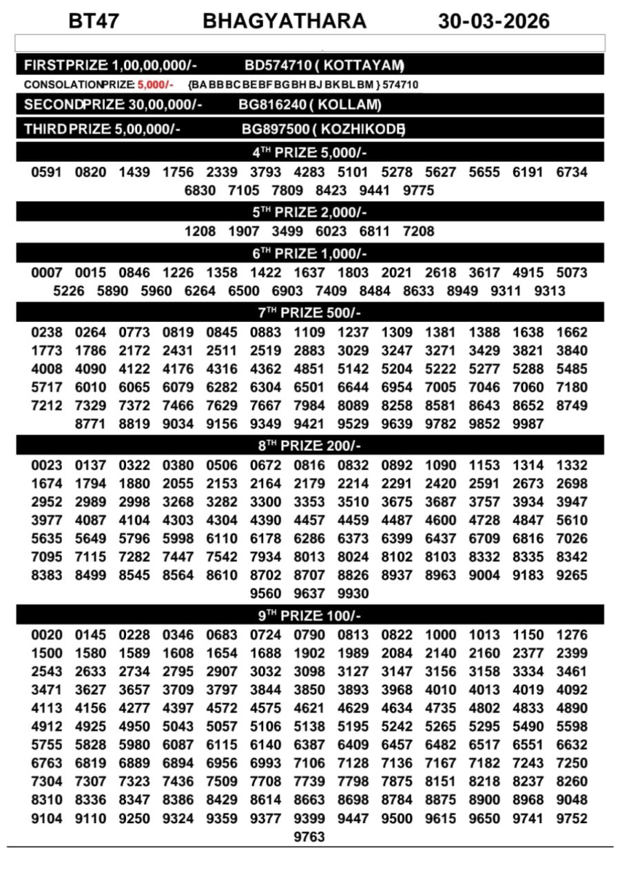 Kerala Lottery Result Today – Bhagyathara BT-48 | 30 March 2026 March 30, 2026 Related Results Kerala Lottery Result Today – DhanaLekshmi DL-40 | 18 February 2026 Kerala Lottery Result Today – Sthree Sakthi SS-514 | 07 April 2026 Kerala Lottery Result Today – Samrudhi SM-48 | 29 March 2026 Kerala Lottery Result Today – Karunya Plus KN-612 26 February 2026