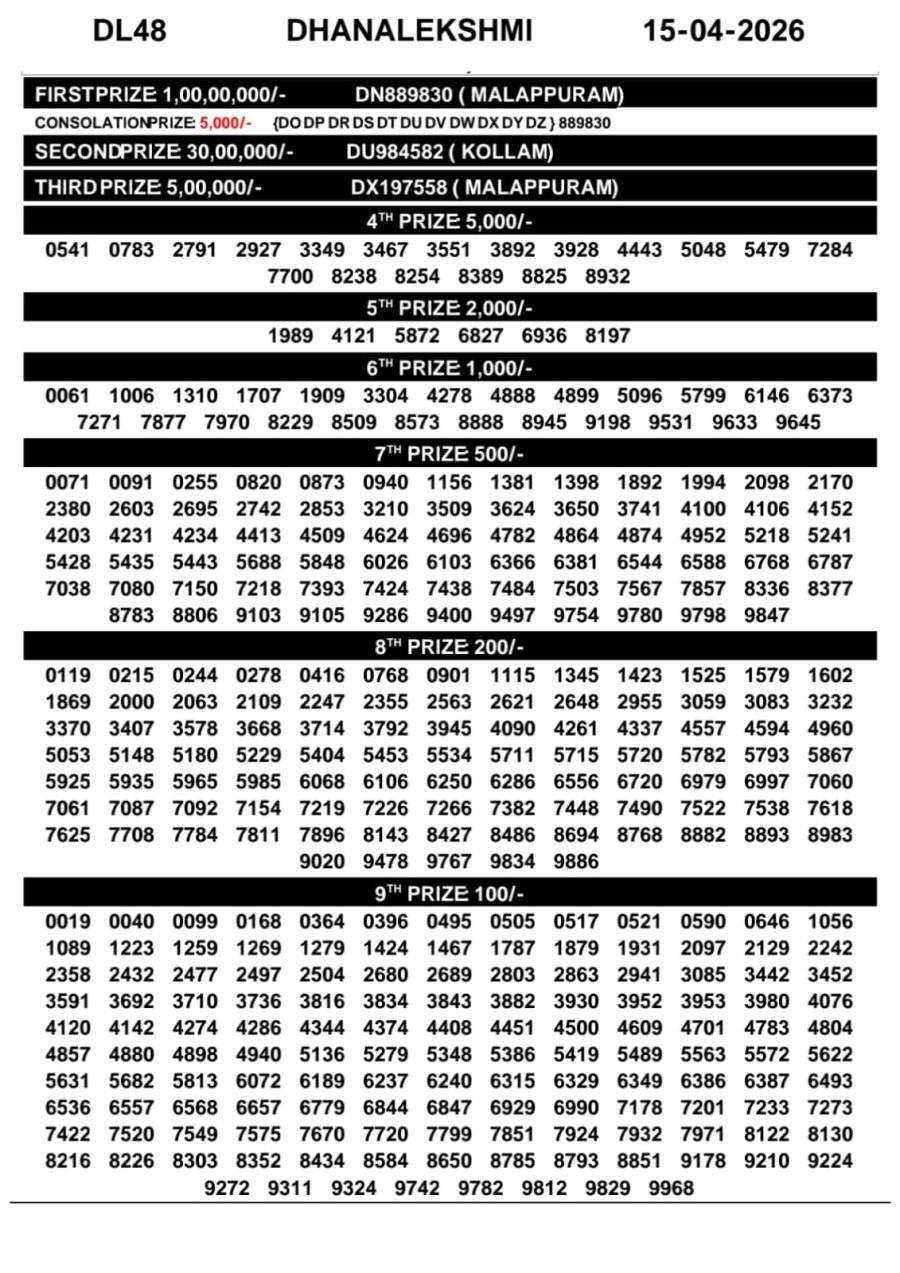 Kerala Lottery Result Today – Dhanalekshmi DL-48 15 April 2026 April 15, 2026 Related Results LabhLaxmi Lottery Result Today 4 PM – 04 February 2026 – Live Draw & Winners Rajshree Lottery Result Today 4 PM – 26 May 2025 – Full Winner List Rajshree Lottery Result Today 4 PM – 24 August 2025 – Live Draw & Winners Rajshree Lottery Result Today 4 PM – 26 March 2026 – Live Draw & Winners