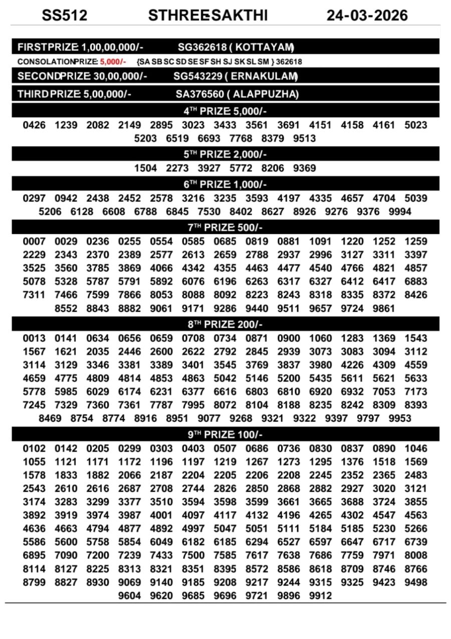 Kerala Lottery Result Today – Sthree Sakthi SS-512 24 March 2026 March 24, 2026 Related Results Suvarna Keralam Lottery Result Today 26 December 2025 Kerala Lottery Result Today – DhanaLekshmi DL-40 | 18 February 2026 Kerala Lottery Result Today – Karunya KR-745| 28 February 2026 Kerala Lottery Result Today Karunya KR7-40 31 January 2026