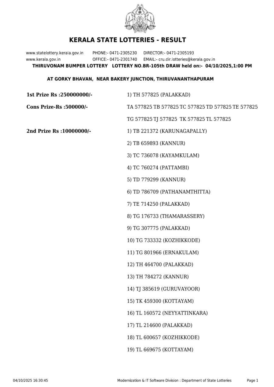 Kerala state Lottery Result 10.04.2025 Thiruvonam Bumper BR 105 Winner list &Prize Breakdown October 4, 2025 Related Results Rajshree 200 monthly lottery result 15 may 2025 Rajshree 250 Monthly Lottery Result 05.08.2025 Live Draw & winners Golden 250 monthly lottery result 25 June 2025 Rajshree 30 Lottery Result 8:30 PM – 22 September 2025 – Live Draw & Winners