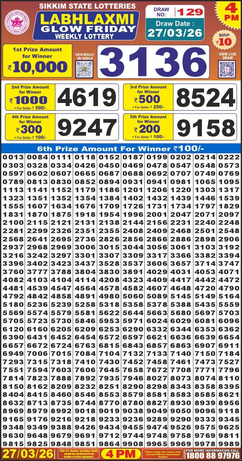 LabhLaxmi Lottery Result Today 4 PM – 27 March 2026 – Live Draw & Winners March 27, 2026 Related Results Rajshree Lottery Result Today 4 PM – 20 August 2025 – Live Draw & Winners Rajshree Lottery Result Today 4 PM – 29 October 2025 – Live Draw & Winners Rajshree Lottery Result Today 4 PM – 14 January 2026 – Live Draw & Winners LabhLaxmi Lottery Result Today 4 PM – 28 March 2026 – Live Draw & Winners