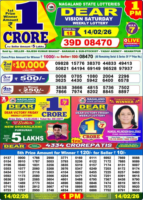 Dear Lottery 1 PM Result Today – 14 February 2026 – Live Draw & Winners