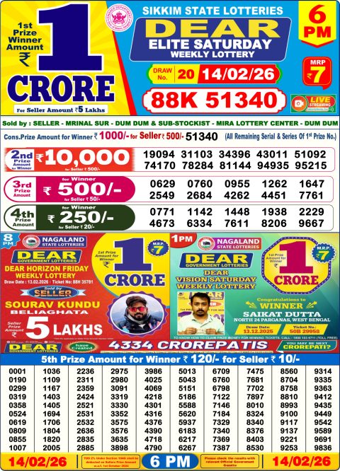 Dear Lottery Result 6 PM – 14 February 2026 – Live Draw & Winners
