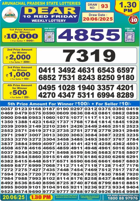 Dear 10 Lottery Result Today 1:30 PM – 20 June 2025 – Live Draw & Winners
