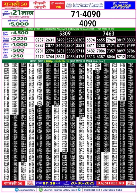 Rajshree 50 Lottery Result Today 7:30 PM – 20 June 2025 – Live Draw & Winners