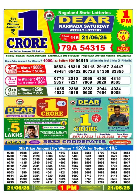 Dear Lottery 1 PM Result Today – 21 June 2025 – Live Draw & Winners