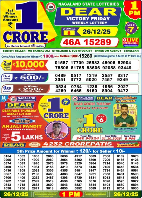 Dear Lottery 1 PM Result Today – 26 December 2025 – Live Draw & Winners