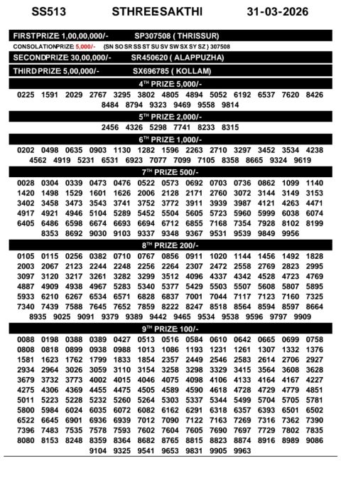 Kerala Lottery Result Today – Sthree Sakthi SS-513 31 March 2026