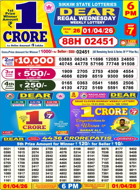 Dear Lottery Result 6 PM – 01 April 2026 – Live Draw & Winners
