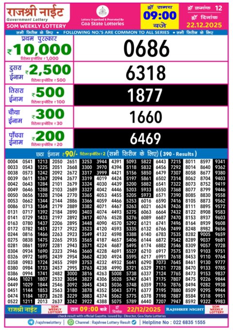 Rajshree Night Lottery 9pm Result 22 December 2025