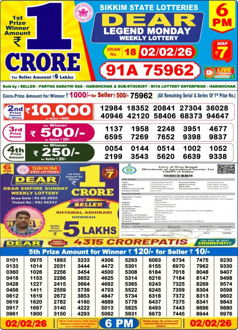 Dear Lottery Result 6 PM – 02 February 2026 – Live Draw & Winners