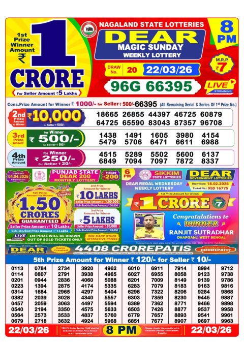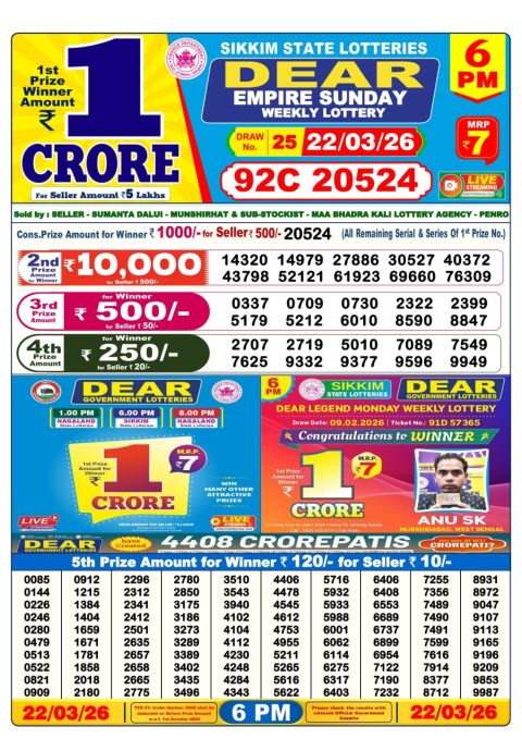 Dear Lottery Result 6 PM – 22 March 2026 – Live Draw & Winners