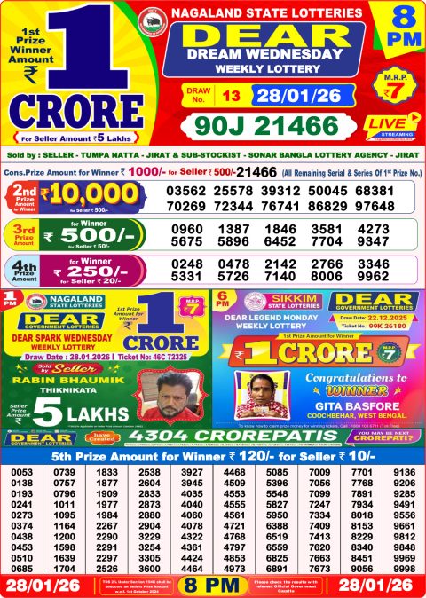 Dear Lottery 8 PM Result – 28 January 2026 – Live Draw & Winners
