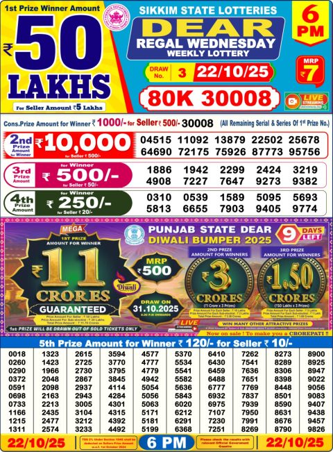 Dear Lottery Result 6 PM – 22 October 2025 – Live Draw & Winners