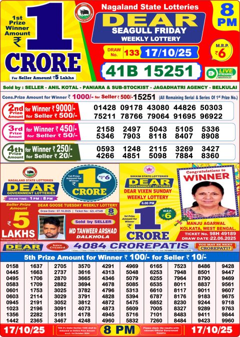 Dear Lottery Result 6 PM – 17 October 2025 – Live Draw & Winners