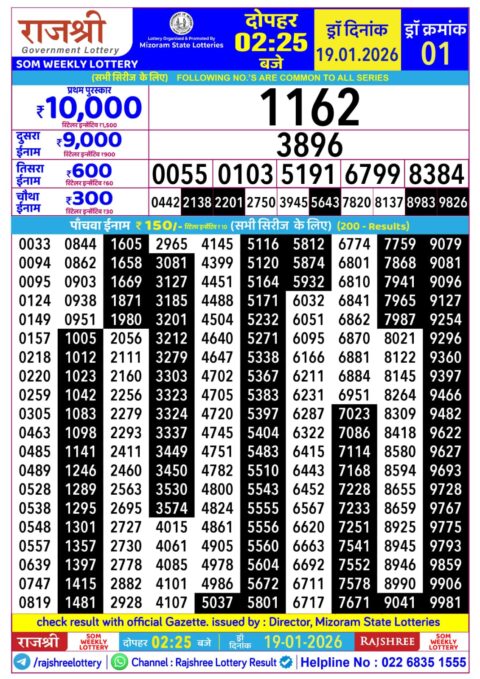 Rajshree Lottery Result 2.25 PM – 19 January 2026 – Live Draw & Winners