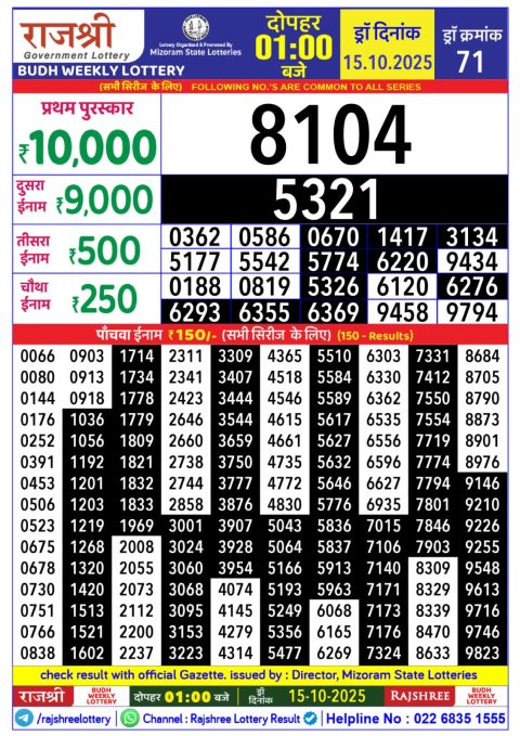 Rajshree Lottery Result 1 PM – 15 October 2025 – Live Draw & Winners