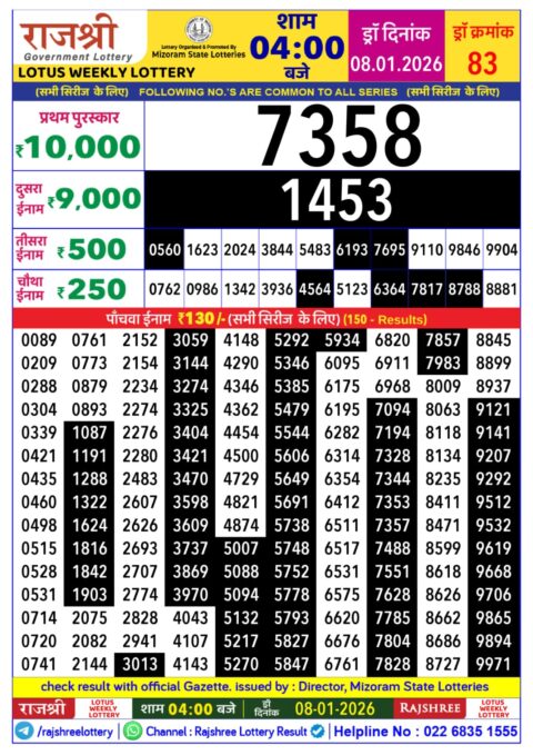Rajshree Lottery Result 1 PM – 08 January 2026 – Live Draw & Winners