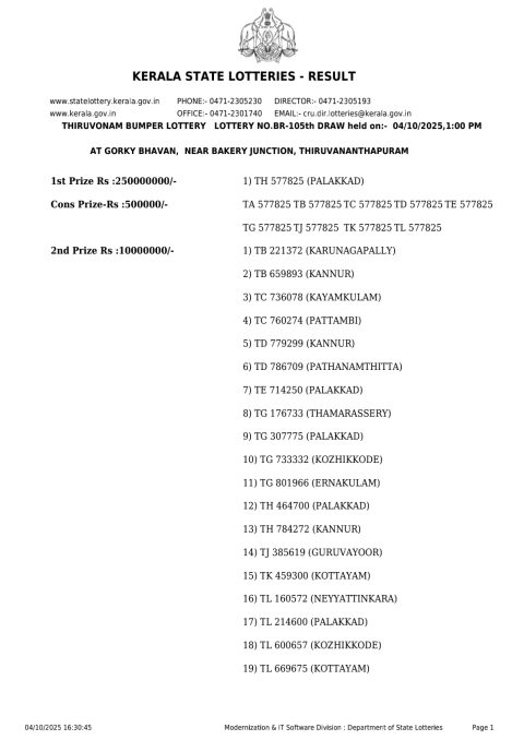 Kerala state Lottery Result 10.04.2025 Thiruvonam Bumper BR 105 Winner list &Prize Breakdown