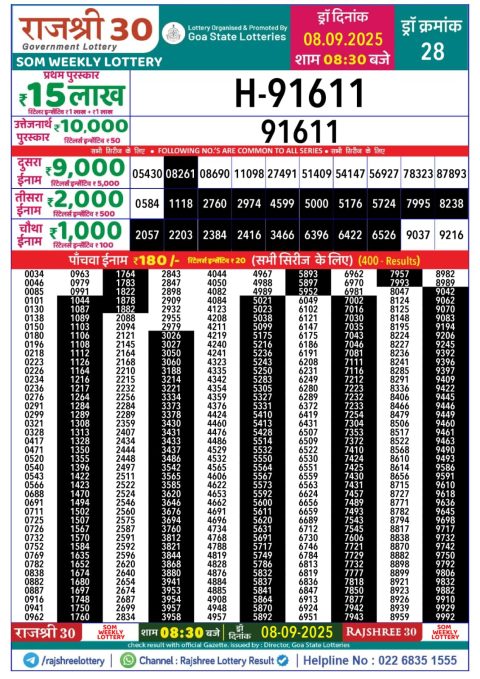 Rajshree 30 Lottery Result 8:30 PM – 8 September 2025 – Live Draw & Winners