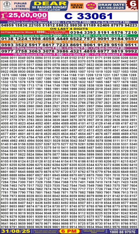 Punjab State Dear 50 Lottery Result – 6 PM Draw – 31 August 2025 – Live Draw & Winners