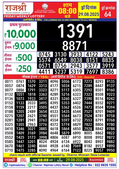 Rajshree Lottery 8 PM Result – 29 August 2025 – Live Draw & Winners