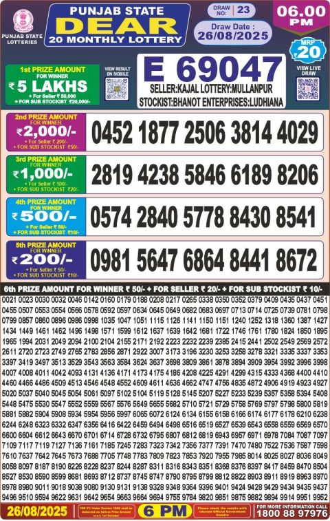 Punjab State Dear 20 Monthly Lottery Result 26 August 2025