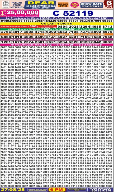 Punjab State Dear 50 Lottery Result – 6 PM Draw – 27 August 2025 – Live Draw & Winners