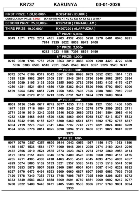 Kerala Lottery Result Karunya KR 737 3 January 2026 Today Lottery Name: Karunya (KR) Weekly Lottery Draw…