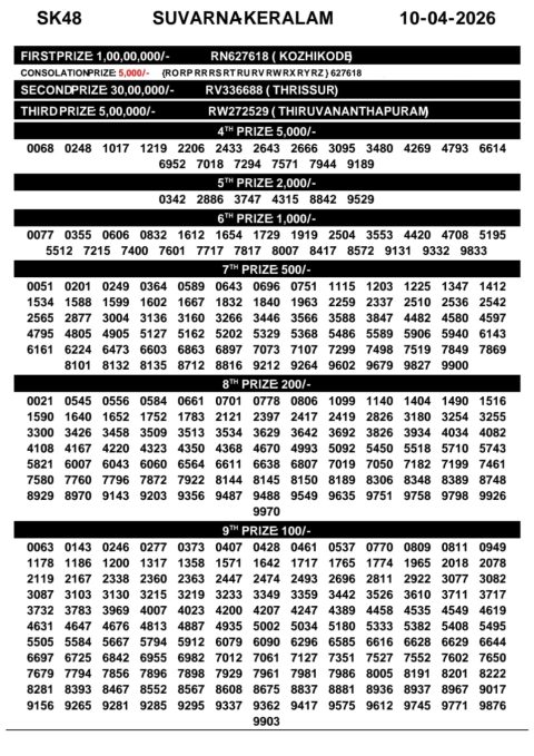 Kerala Lottery Result Today – Suvarna Keralam SK-48 10 April 2026