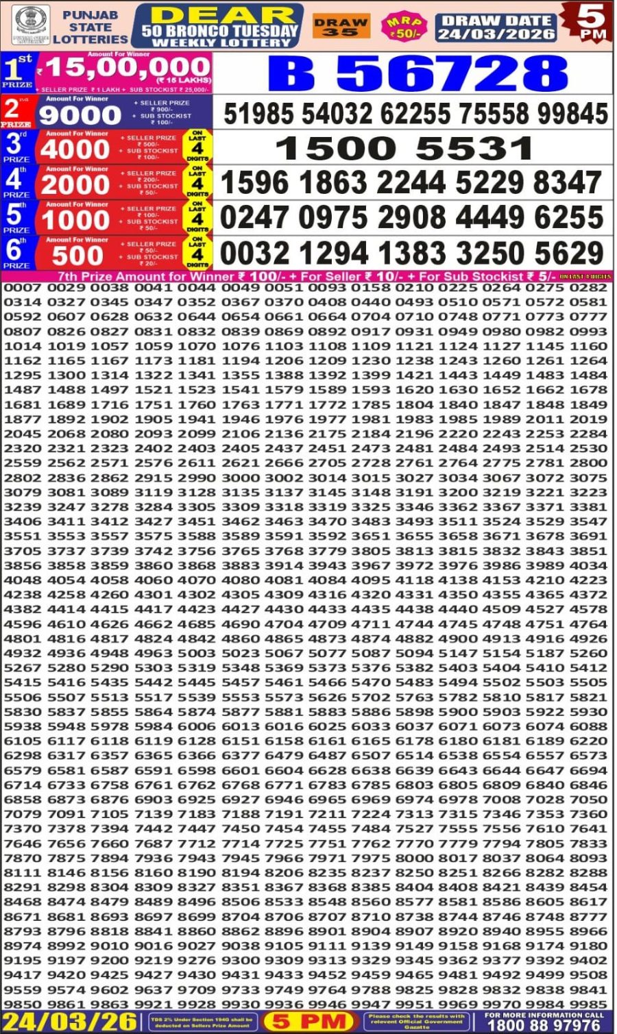 Punjab State Dear 50 Lottery Result – 5 PM Draw – 24 March 2026 – Live Draw & Winners March 24, 2026 Related Results Dear 100 Lottery Result 5 PM Today – 12 July 2025 – Live Draw & Winners Punjab State Dear 50 Lottery Result – 5 PM Draw – 11 February 2026 – Live Draw & Winners Dear 100 Lottery Result 5 PM Today – 03 July 2025 – Live Draw & Winners Dear 50 Lottery Result 5 PM Today – 13 July 2025 – Live Draw & Winners