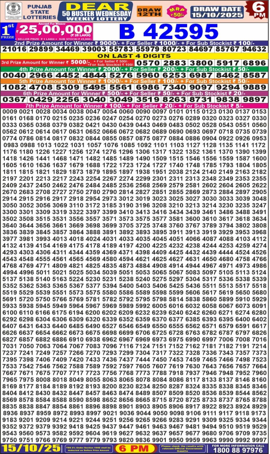 Punjab State Dear 50 Lottery Result – 6 PM Draw – 15 October 2025 – Live Draw & Winnersr October 15, 2025 Related Results Dear Lottery Result 6 PM – 30 October 2025 – Live Draw & Winners Dear Lottery Result 6 PM – 23 June 2025 – Live Draw & Winners Dear Lottery Result 6 PM – 15 July 2025 – Live Draw & Winners Dear Lottery Result 6 PM – 30 September 2025 – Live Draw & Winners