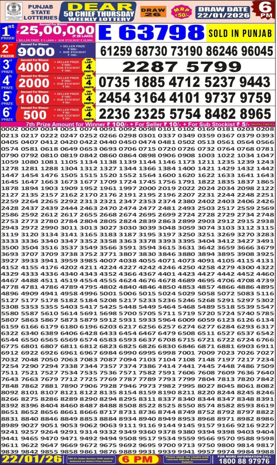 Punjab State Dear 50 Lottery Result – 6 PM Draw – 22 January 2026 – Live Draw & Winners January 22, 2026 Related Results Punjab State Dear 50 Lottery Result – 6 PM Draw – 26 December 2025 – Live Draw & Winners Dear Lottery Result 6 PM – 17 September 2025 – Live Draw & Winners Dear Lottery Result 6 PM – 08 October 2025 – Live Draw & Winners Dear Lottery Result 6 PM – 19 February 2026 – Live Draw & Winners