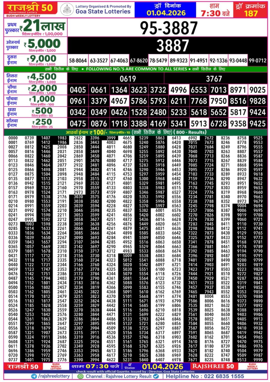 Rajshree 50 Lottery Result Today 7:30 PM – 01 April 2026 – Live Draw April 1, 2026 Related Results Rajshree 50 Lottery Result Today 7:30 PM – 11 January 2026 – Live Draw Rajshree 50 Lottery Result Today 7:30 PM – 03 October 2025 – Live Draw & Rajshree 50 Lottery Result Today 7:30 PM – 2 July 2025 – Live Draw & Rajshree 50 Lottery Result Today 7:30 PM – 21 May 2025 – 1st Prize 21 Lakhs