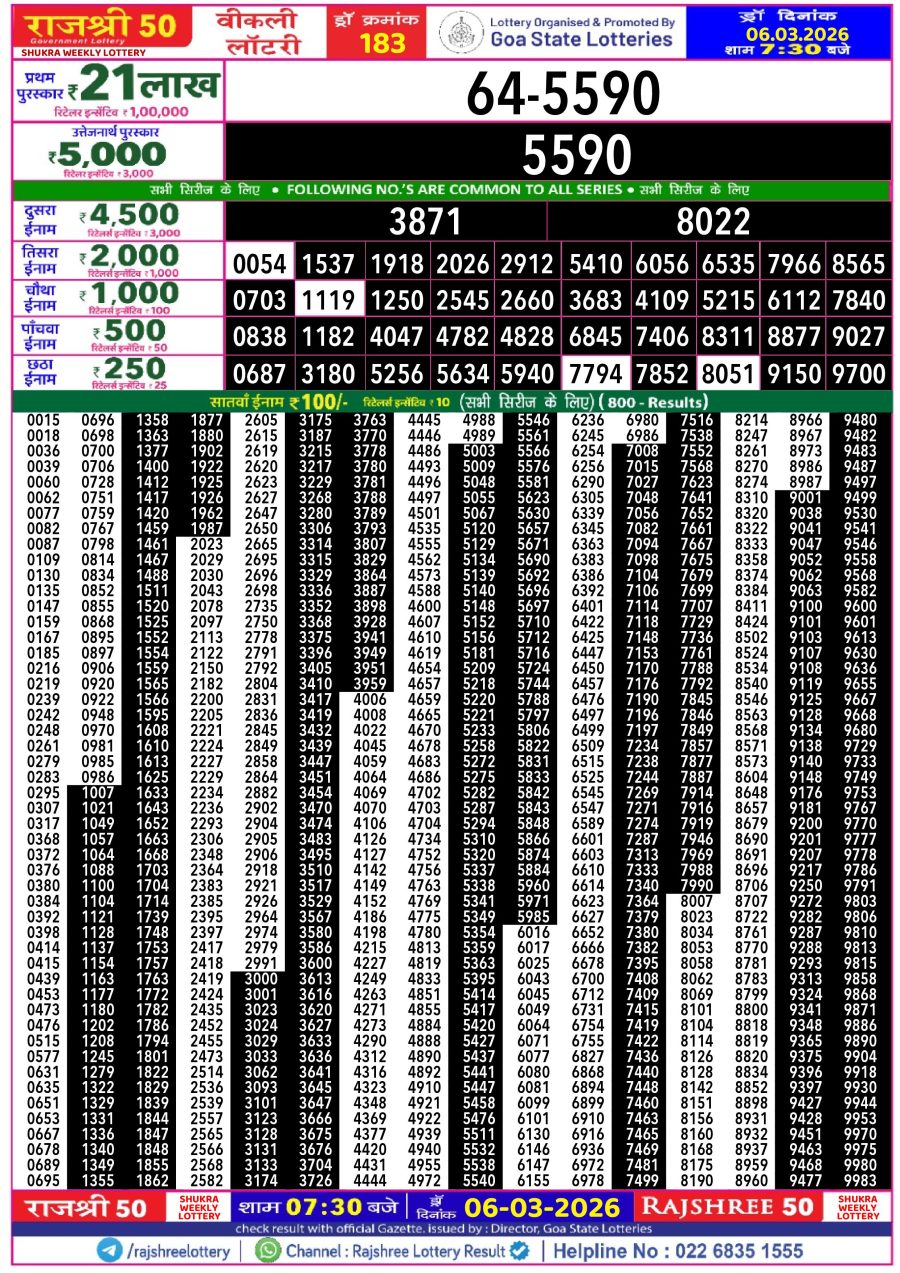 Rajshree 50 Lottery Result Today 7:30 PM – 06 March 2026 – Live Draw March 6, 2026 Related Results Rajshree 50 Lottery Result Today 7:30 PM – 22 November 2025 – Live Draw Rajshree 50 Lottery Result Today 7:30 PM – 05 August 2025 – Live Draw & Rajshree 50 Lottery Result Today 7:30 PM – 24 July 2025 – Live Draw & Rajshree 50 Lottery Result Today 7:30 PM – 20 May 2025 – 1st Prize 21 Lakhs
